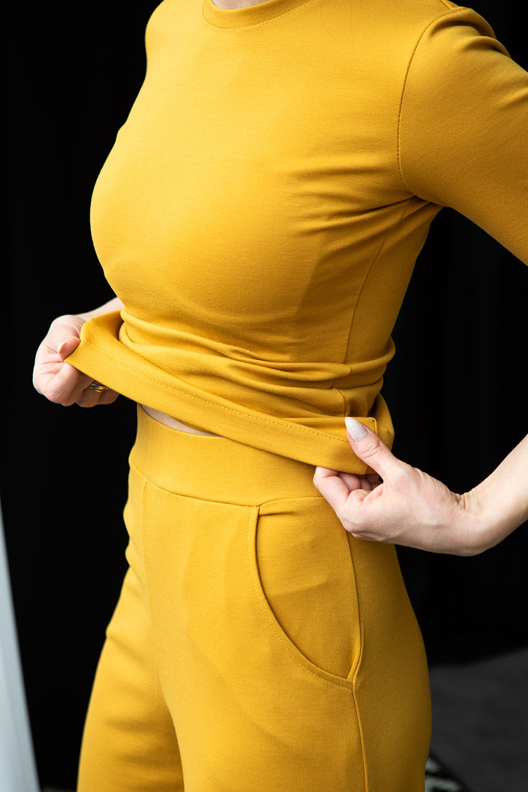 This sophisticated two-piece set combines clean lines, comfort, and modern elegance. The fitted short-sleeve top highlights the waist with its smooth, sculpting silhouette, while the high-waisted wide-leg trousers create a beautifully elongated figure. Crafted from a soft, structured viscose jersey fabric, the set moves gracefully and retains its refined shape throughout the day.